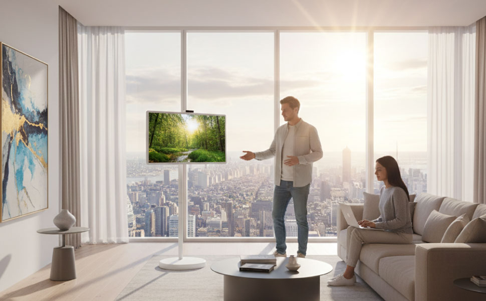 Effortless Mobility: The signature minimalist white stand features a low-profile wheeled base. Glide your 32-inch display between your home office, bedroom, or living room with a single hand.