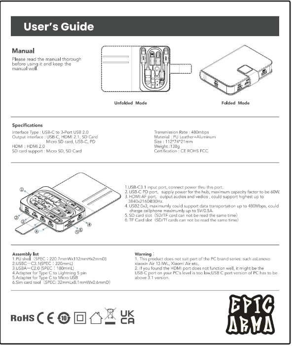 Included components: Epic Arma USB-C Hub (6-in-1 Foldable), Type-C to Micro USB Adapter, Type-C to Lightning Adapter