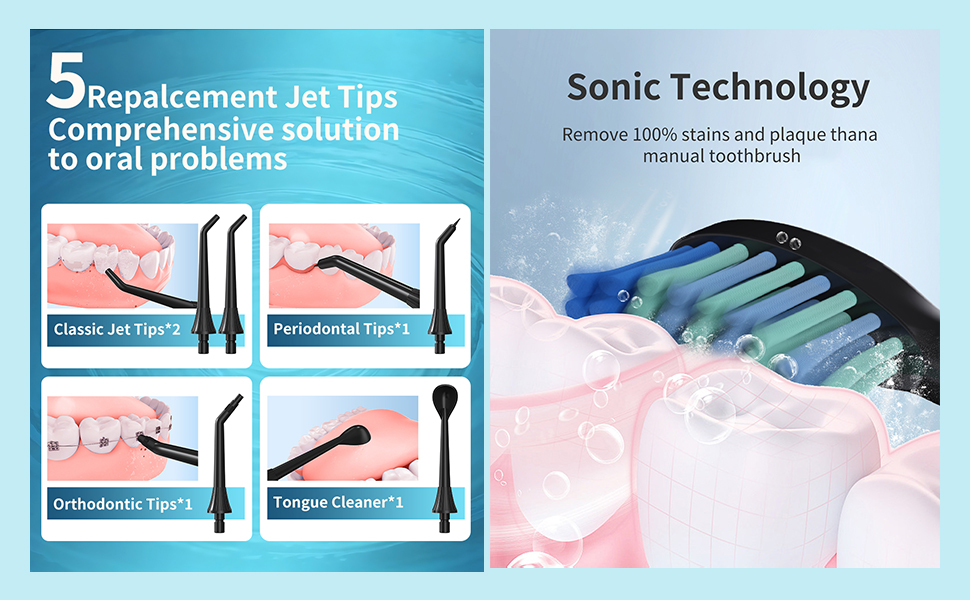 • Dual-Action Performance: Seamlessly transition between sonic vibrations for deep enamel cleaning and precise, high-pressure water streams to target plaque and debris in hard-to-reach interdental spaces.