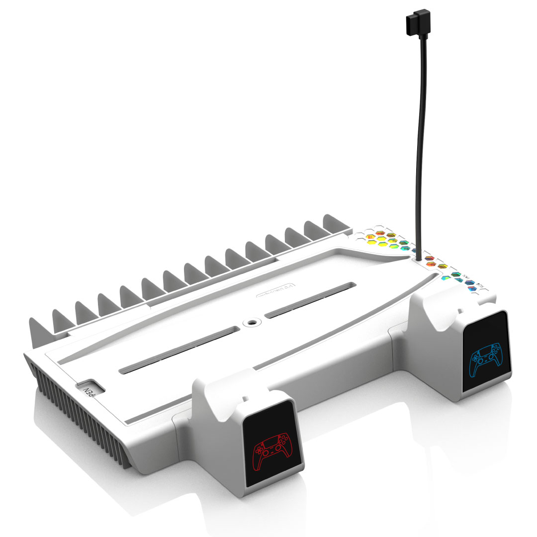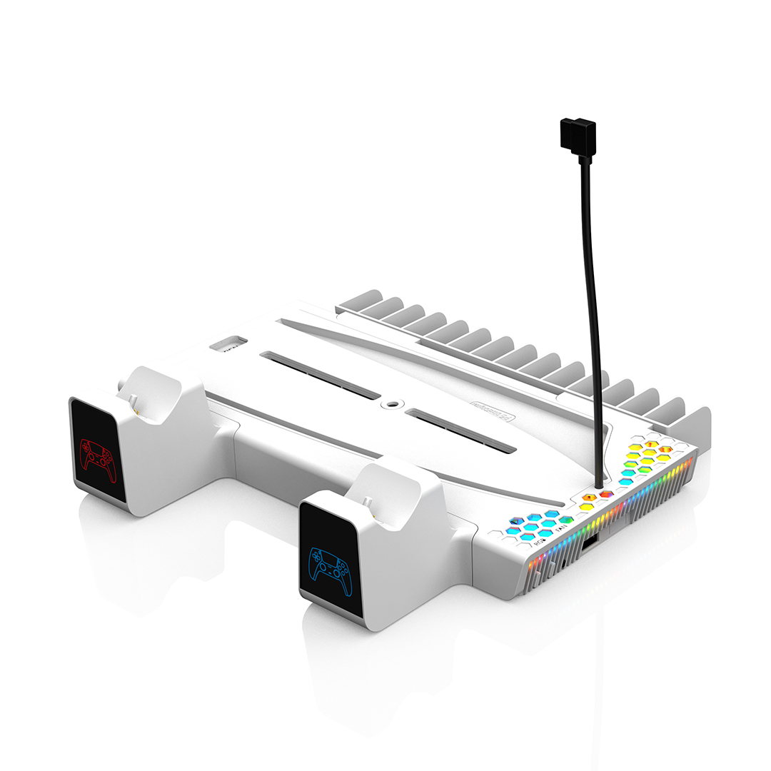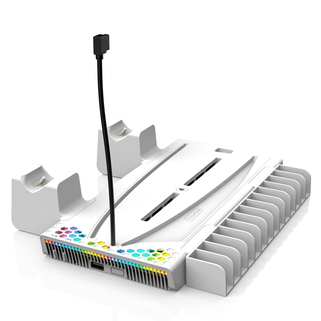 - Minimalist Cinematic Design: Engineered with a sleek, white aesthetic, this station complements the PS5’s signature look. Its compact, low-profile footprint ensures it fits perfectly into any entertainment center, while the dynamic RGB accents add a touch of customizable gaming flair.