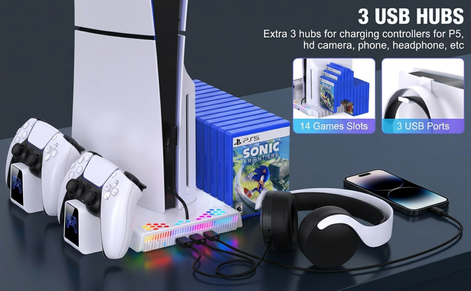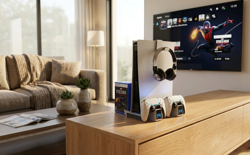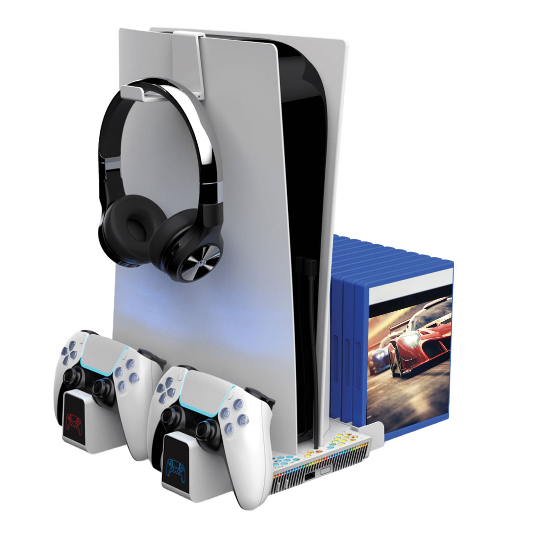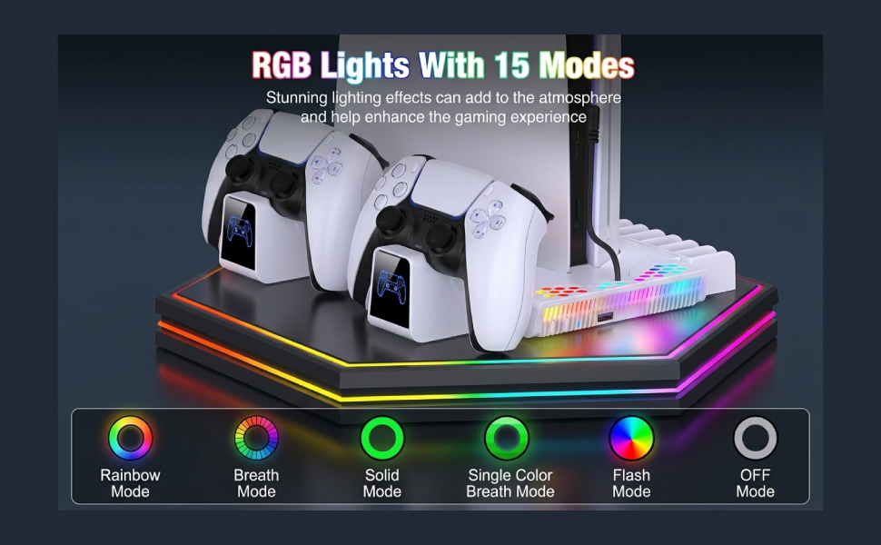 - Minimalist Cinematic Design: Engineered with a sleek, white aesthetic, this station complements the PS5’s signature look. Its compact, low-profile footprint ensures it fits perfectly into any entertainment center, while the dynamic RGB accents add a touch of customizable gaming flair.